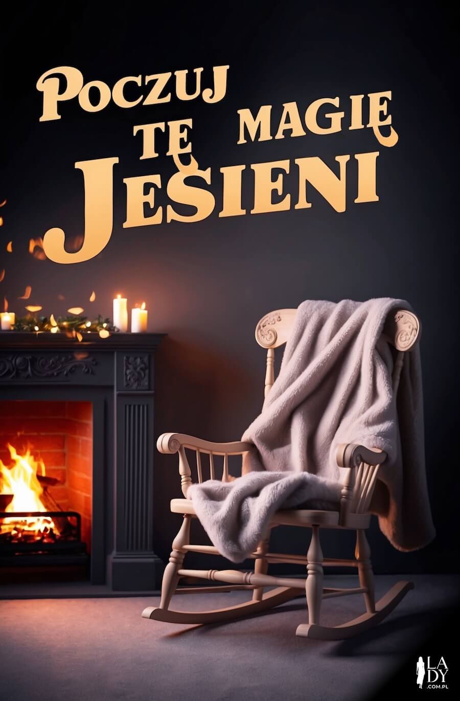 Inspirująca kartka do wysłania 23 września bliskim i znajomym, wygodny fotel bujany z kocykiem przy rozpalonym kominku w pokoju, z napisem: Poczuj tę magię jesieni