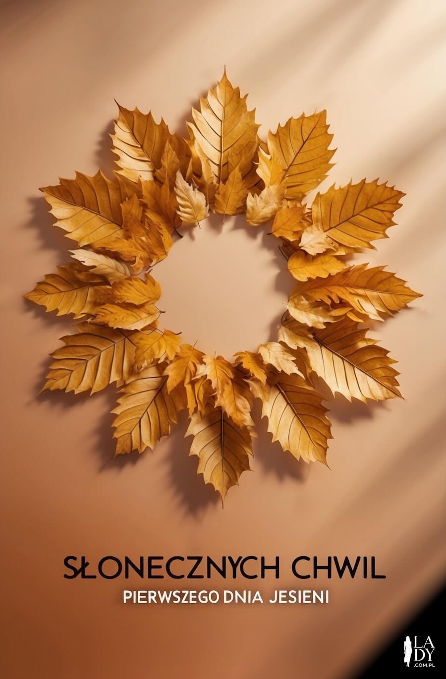 Oryginalna kartka na Pierwszy Dzień Jesieni, jesienne liście ułożone na kształt słońca, z napisem: Słonecznych chwil pierwszego dnia jesieni