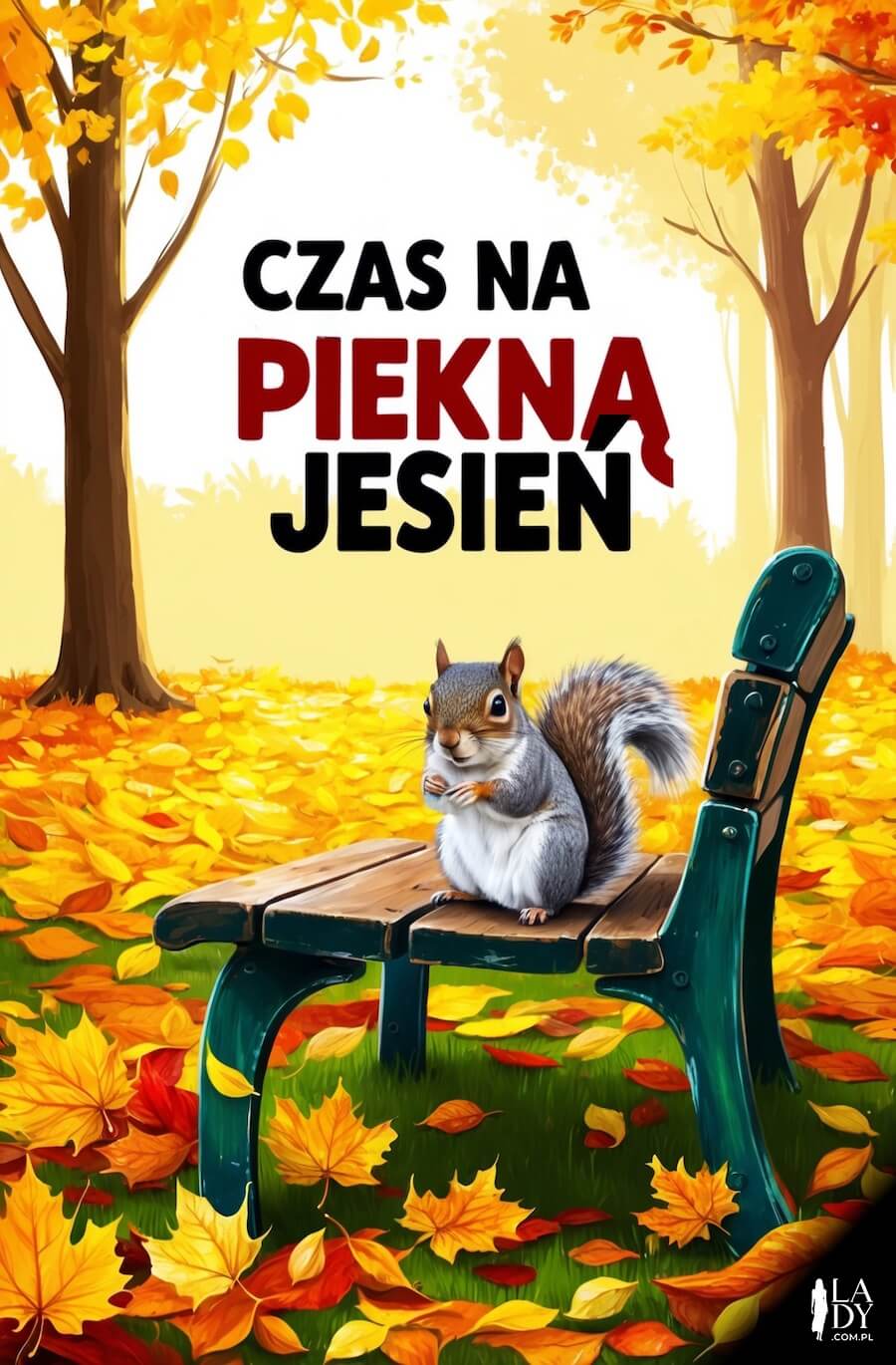Zabawna ilustracja przedstawiająca wiewiórkę na ławce w parku jesienią, z tekstem: Czas na piękną jesień