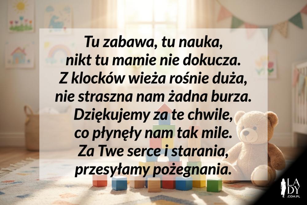 W tej sekcji znajdziecie uniwersalne wierszyki, które idealnie sprawdzą się na dyplomach czy oficjalnych kartkach pożegnalnych. Są rytmiczne, ciepłe i łatwe w odbiorze, skupiając się na motywach bezpiecznej zabawy i domowej atmosfery, którą Panie stworzyły w żłobku.