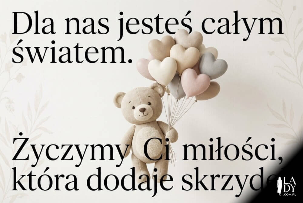 • „Dla świata możesz być tylko jedną z wielu osób, ale dla nas – Babci i Dziadka – jesteś całym światem. Życzymy Ci miłości, która dodaje skrzydeł, i ludzi wokół, którzy docenią Twój wielki skarb – dobre serce.”