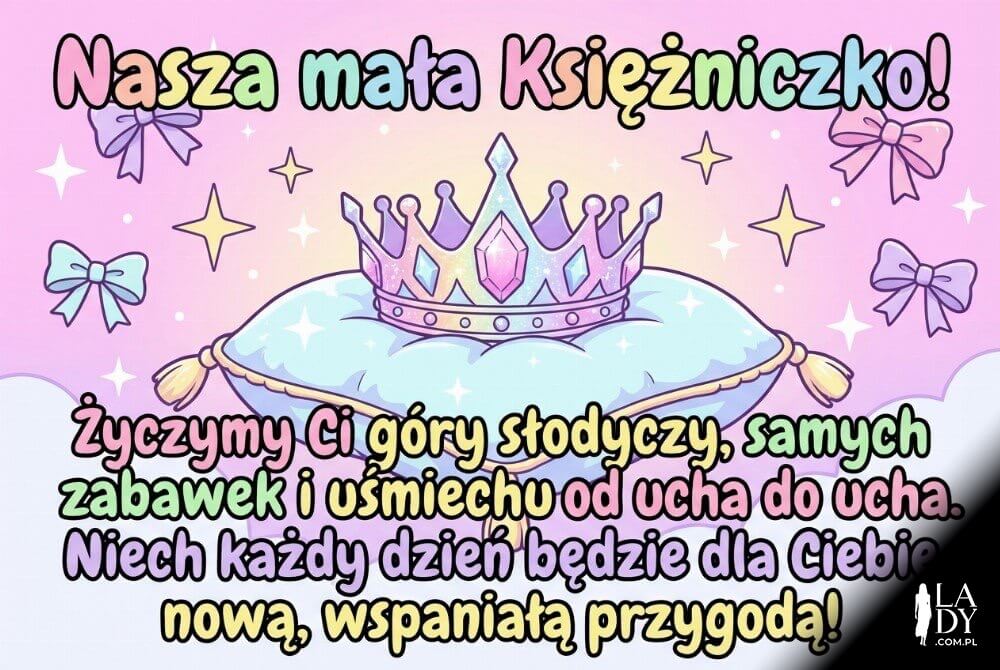 • „Nasza mała Księżniczko! Życzymy Ci góry słodyczy, samych wspaniałych zabawek i uśmiechu od ucha do ucha. Niech każdy dzień będzie dla Ciebie nową, wspaniałą przygodą!”