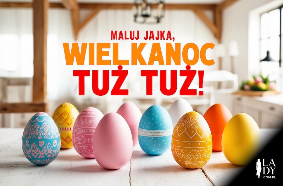 Kolorowe jajka, pisanki malowane na stole w kuchni, z tekstem zachęcającym do działania: Maluj jajka, Wielkanoc tuż tuż