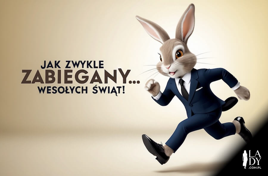 „Wyobraź sobie królika w garniturze, niosącego teczkę pełną czekoladowych jajek. Absurdalne? Nie bardziej niż życzenia, które właśnie czytasz! Wesołej Wielkanocy!”