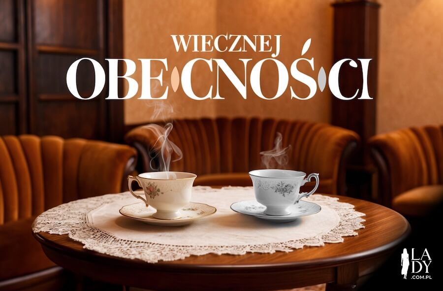 Dwie filiżanki herbaty na stole w pokoju dziennym, ze słowami otuchy: Wiecznej obecności