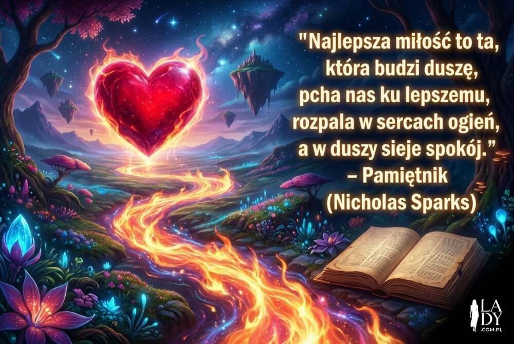 • „Najlepsza miłość to ta, która budzi duszę, pcha nas ku lepszemu, rozpala w sercach ogień, a w duszy sieje spokój.” – Pamiętnik (Nicholas Sparks)