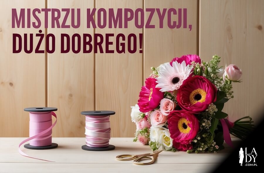 „Twoje dłonie zamieniają zwykłe kwiaty w poezję barw i zapachów. W dniu Twojego święta życzę Ci nieustającej inspiracji i radości z tworzenia piękna, które rozświetla nasz świat.”